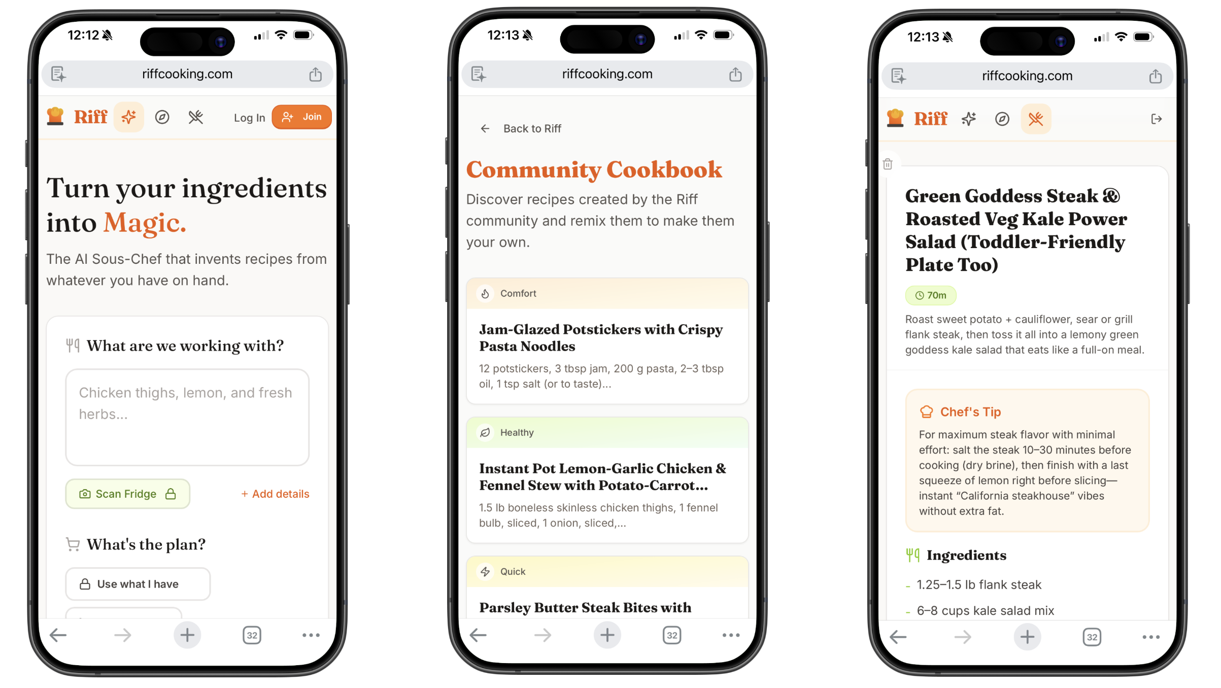 Enter Riff. An AI sous chef that turns your fridge into dinner.